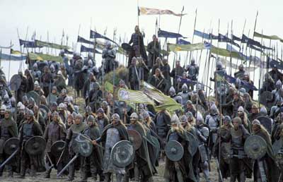當然一部電影打動人的,決不是僅僅因為運用高科技精細制作、角色的完美塑造,更重要的是故事里所表現出的人性。在美國電影里,這其實是一種俗套,但是人性就是生活中最重要的東西,沒有人性的表現,不管什么樣的故事都會變得蒼白。《魔戒3》就是在人性的表現上非常出眾。剛多國攝政王在戰爭前夕的懦弱和精神崩潰,甘道夫的大義凜然和對生死的超脫,阿拉貢的勇敢和堅強,以及在困境中朋友的相扶相攜,不離不棄。這其中弗拉多與山姆在護送魔戒的途中所產生的信任危機,就在傳遞魔戒的那一瞬間,只需要一個眼神一個表情就表現出面對誘惑時,人的貪婪與理性的斗爭。《魔戒3》的情節應該說不如前兩部豐富,重頭戲主要是戰爭場面的描寫,但是在這最后的決戰中,人性的表現就是一根線時隱時現的穿插在故事中間。