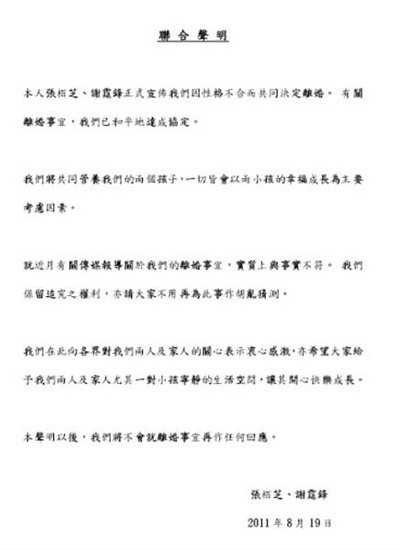 本人張柏芝、謝霆鋒正式宣布我們因性格不合而共同決定離婚。有關(guān)離婚事宜,我們已和平地達(dá)成協(xié)定。