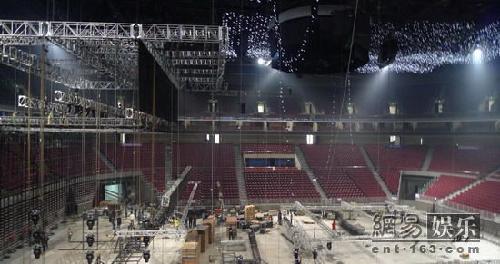 五棵松體育館內工作人員還在為舞臺忙碌。