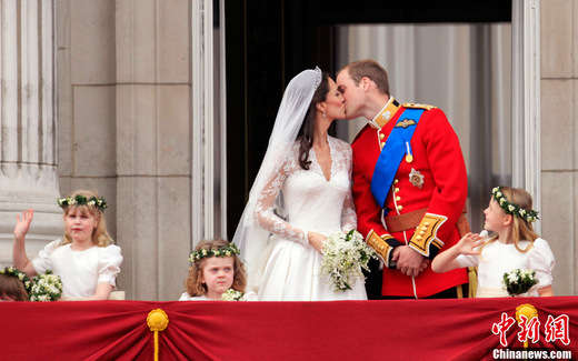 4月29日,英國倫敦,威廉王子與凱特在白金漢宮陽臺深情一吻。當地時間11時,英國威廉王子與攜手相戀多年的女友凱特·米德爾頓,正式步入婚姻殿堂,舉辦一場新世紀的“童話婚禮”。