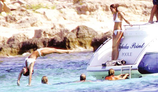 皮帕姿態(tài)優(yōu)雅地向后跳水。按英國(guó)《每日郵報(bào)》說法,威廉王子像其他年輕男子一樣,也表演起向后跳水,“取悅”凱特。不過,他似乎沒有掌握要領(lǐng),肚子先著水。