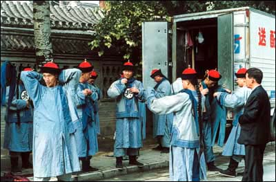 7月22日下午,在老廠工的指引下,記者來到了北京電影制片廠明清一條街,見到了遼寧來的小伙高峰(化名)。高峰原來在北京某酒店當大堂經理,“前幾個月北京鬧非典的時候,酒店遭受嚴重打擊。”高峰下崗,懷揣著進軍影視圈的夢想在北影做起了群眾演員。