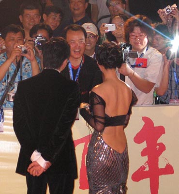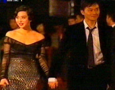 香港明星張智霖與內(nèi)地影人范冰冰手牽手踏上紅地毯,還不時(shí)向歡呼的群眾揮手。張智霖的領(lǐng)帶系得很松,顯示出別樣的瀟灑。而范冰冰身著低胸晚裝亮相,性感迷人。