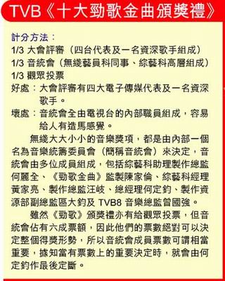 據香港媒體報道,樂壇頒獎禮雖然與歌手沒有直接的利益關系,但各大唱片公司每年都為旗下的歌手極力爭取各樣獎項,原來背后涉及唱片公司的龐大利益關系。雖然歌手在頒獎禮中奪獎是不會為他帶來直接利益,卻會令歌手人氣急升,奠定其在樂壇地位,尤其是成功贏得“最受歡迎男歌手”及“最受歡迎女歌手”等獎項的人,其樂壇天王、天后地位、身價更是毋庸置疑。