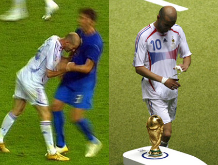 在齊達內離開球場的時候,他正好從大力神杯旁邊經過,他落寞的身影與金光閃閃的獎杯形成強烈的反差。當他走到場邊的時候瞄了大力神杯一眼,從他的眼神中可以看出齊達內渴望能夠捧得獎杯。當舉行頒獎儀式的時候,齊達內并沒有出現在人們的視野當中,也許他在休息室中正在為自己的不冷靜行為懊悔不已,可以說是他將大力神杯拱手送給了意大利人,也許本場比賽將是齊達內心中永遠的痛。