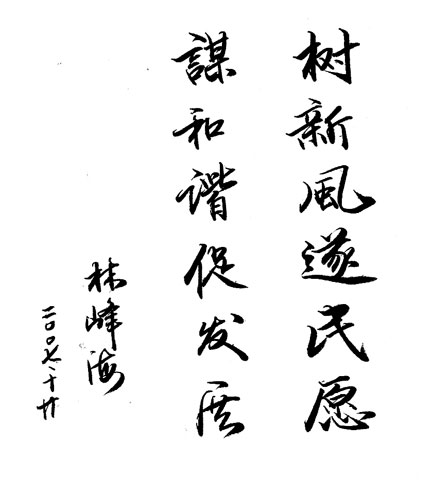 在慶祝齊魯晚報創(chuàng)刊20周年之際,聊城市市長林峰海為本報題詞:“樹新風遂民愿 謀和諧促發(fā)展”。