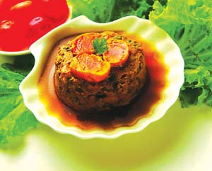 制作:將絞好的肉放入碗內,加入絞好的醬黃瓜、米酒、醬油、味精、胡椒粉、砂糖、雞粉攪拌至完全吸收,拿罐將蛋黃放在下面,把拌好的肉放入罐中,加上汁蒸熟(約20分鐘)即可上桌。