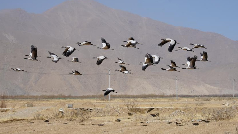 2023年12月,在雅江北岸生態示范區,黑頸鶴在空中自由翱翔。(新華網)