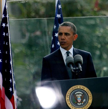 紐約世貿遺址于美東時間11日上午舉行悲愴的默哀儀式,悼念“9·11”恐怖襲擊事件十周年。美國總統奧巴馬夫婦和前總統小布什夫婦,以及美國國務卿希拉里等出席儀式。