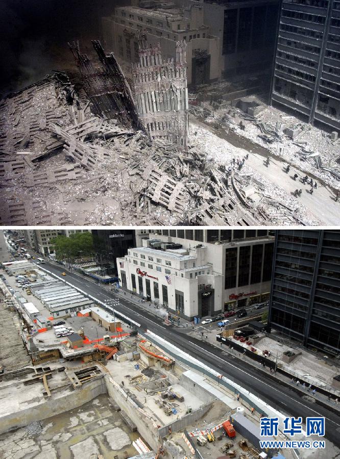 “零地帶”一詞先前被用于形容核爆炸區(qū)域,后用于描述極端和暴力事件發(fā)生地。2001年9月11日,恐怖分子劫持4架客機(jī),操縱其中兩架撞入世貿(mào)中心雙塔,致死大約3000人。該地也因此被稱為“零地帶”。十年前的“9·11”,這里是人間地獄,十年后的今日,這里正在重建。紐約市長邁克爾·布隆伯格說:“我們永遠(yuǎn)不會忘記這片被稱作‘零地帶’的區(qū)域遭受的破壞,永遠(yuǎn)不會。不過,是時候把這片16英畝(約合6.5公頃)的區(qū)域稱作‘世貿(mào)中心和國家9·11紀(jì)念館’了。”“9·11”恐怖襲擊以來,紐約在遭受重創(chuàng)的曼哈頓下城區(qū)域投資5.52億美元,興建公園、街道等市政設(shè)施并整修下水管道。數(shù)座全新摩天大樓將在世貿(mào)中心遺址拔地而起,而遺址區(qū)域地標(biāo)建筑“9·11”紀(jì)念館定于恐怖襲擊十周年之日對遇難者家屬開放,次日向公眾全面開放。這是“9·11”事件發(fā)生近9個月后,遭受毀滅性襲擊的美國紐約世貿(mào)中心已經(jīng)從一片廢墟(上圖,攝于2001年9月11日)變成一個新的建筑工地(下圖,攝于2002年6月4日)。新華社發(fā)(程麗編輯)