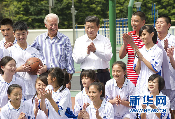 8月21日,國家副主席習(xí)近平同正在中國進(jìn)行正式訪問的美國副總統(tǒng)拜登在四川省都江堰市共同參觀地震災(zāi)后重建項(xiàng)目和都江堰水利樞紐。這是習(xí)近平同拜登參觀青城山高級中學(xué)時(shí),觀看了校男女籃球隊(duì)訓(xùn)練,并與隊(duì)員親切交流并合影。 新華社記者黃敬文攝
