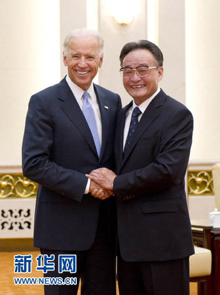 8月18日,中國全國人大常委會委員長吳邦國在北京人民大會堂會見美國副總統拜登。 新華社記者黃敬文攝