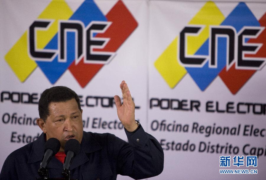 委內瑞拉全國選舉委員會7日宣布,現任總統查韋斯以54%的得票率贏得委內瑞拉總統選舉。這是查韋斯在委內瑞拉首都加拉加斯出席新聞發布會。(10月7日攝) 新華社發(戴維·德拉巴斯攝)