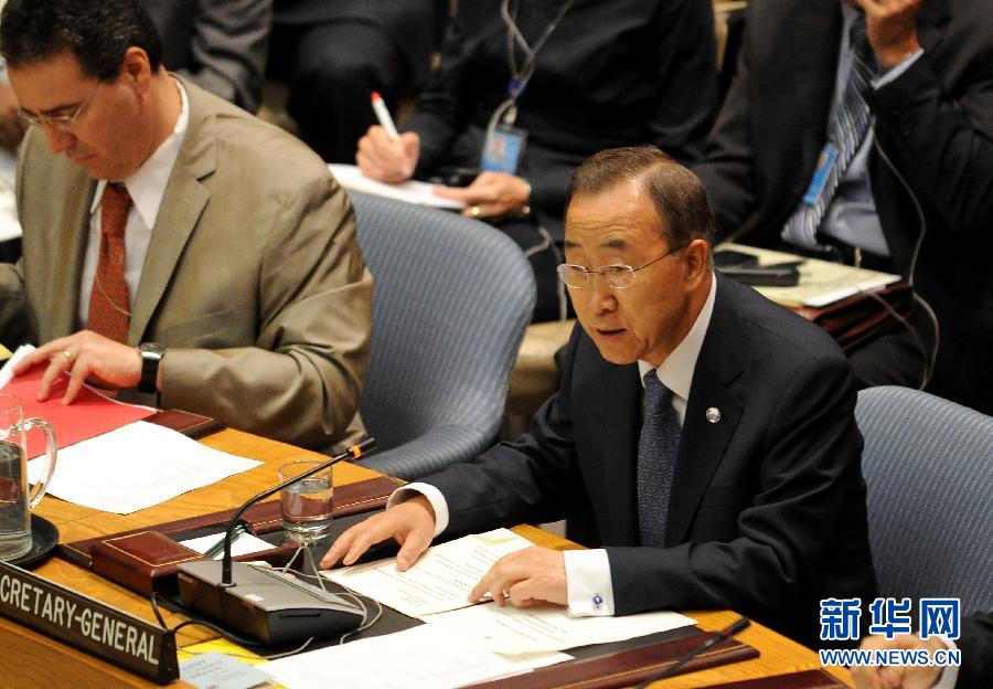 8月26日,在紐約聯(lián)合國總部,聯(lián)合國秘書長潘基文(右)在安理會會議上發(fā)言,強烈譴責當天早上發(fā)生的聯(lián)合國駐尼日利亞機構大樓爆炸事件。位于尼日利亞首都阿布賈的聯(lián)合國機構大樓當?shù)貢r間8月26日遭汽車炸彈襲擊,迄今爆炸已造成至少10人死亡,多人受傷,目前仍有許多人被困在聯(lián)合國大樓內等待援救。新華社記者 申宏攝