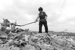 4月23日,唐王鎮司家村,菜農閆廷云在清理丟棄的卷心菜菜葉。