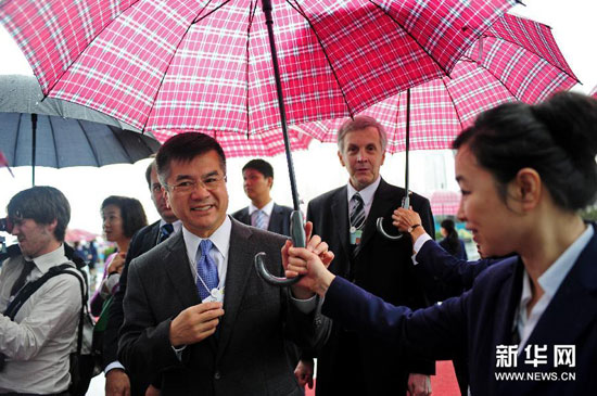 9月14日,工作人員在為參會代表美國駐華大使駱家輝打傘。當日,世界經濟論壇2011年新領軍者年會(簡稱“夏季達沃斯論壇”)在遼寧省大連市開幕。 新華社發(姜冰 攝)