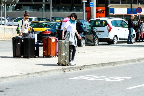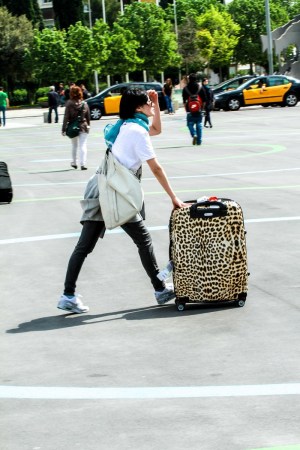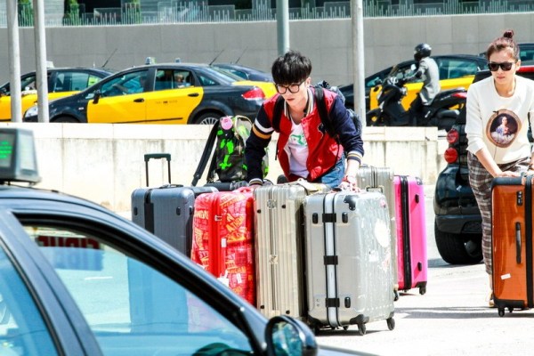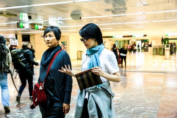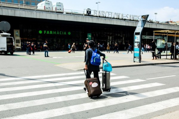 巴塞羅那火車站門口許晴跟花花看行李