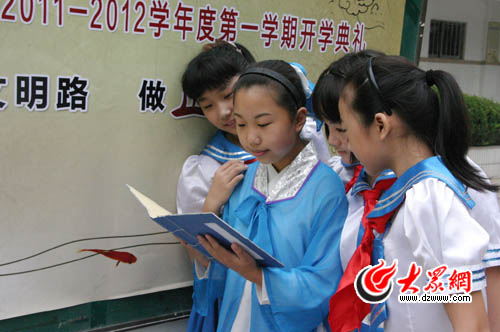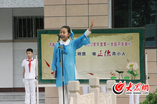 大眾網(wǎng)濟(jì)南9月1日訊(記者 尹玉濤 通訊員 王科科)“學(xué)做人,講文明,禮儀之邦人知曉。樹校風(fēng),強(qiáng)校紀(jì),正德文明記心里。”開學(xué)第一天,濟(jì)南市青龍街小學(xué)組織了以“走至善文明路 做正德青小人”為主題的開學(xué)典禮。小學(xué)生們穿上古裝,朗讀起修生養(yǎng)性的《正德歌》。
