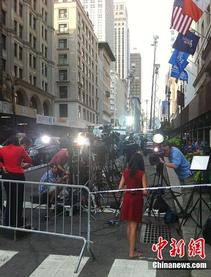 當(dāng)?shù)貢r(shí)間24日,紐約帝國(guó)大廈外發(fā)生槍擊案,造成十多人死傷。事件隨即引發(fā)國(guó)際媒體大戰(zhàn),圖為媒體記者在帝國(guó)大廈外爭(zhēng)相采訪紐約官員。李洋 攝