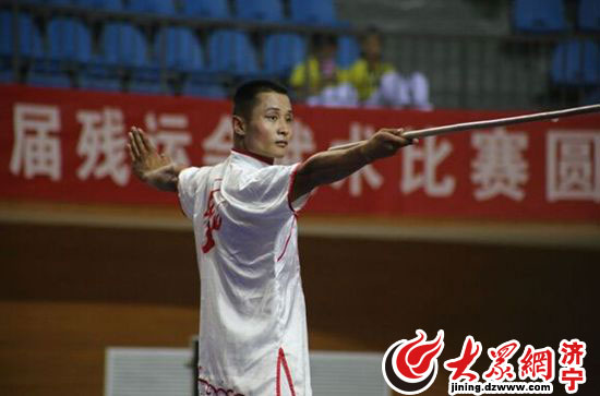 濟寧新聞:24日,山東省九屆殘運會武術比賽在梁山體育館圓滿結束。濟寧代表隊榮獲13枚金牌,金牌總數取得第一名;其中梁山籍運動員共取得6塊金牌,梁山小伙盧傳明分別取得長拳、刀術和棍術3塊金牌。