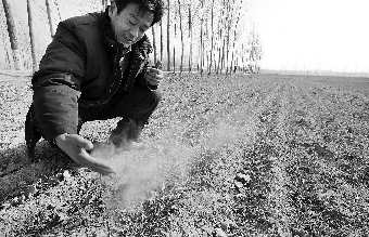 2月6日,在菏澤鄆城縣丁里長鎮張莊村麥田地里,村民老張抓起一把麥田里的土,由于干旱,土壤被風一吹揚起了沙塵。