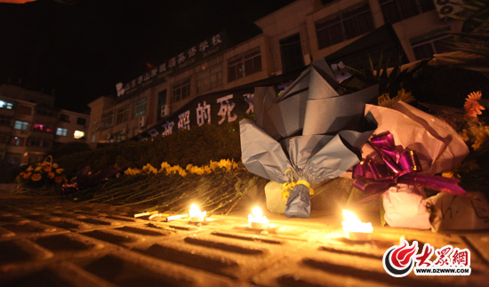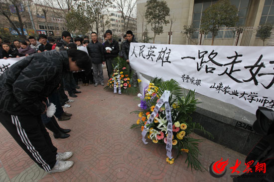 山東農業大學生的學生手捧鮮花趕來了。幾名女大學生作為學生代表,在事發現場向犧牲民警獻花,其中的一位女大學生說:“如果我們社會多一些這樣的英雄,我們的生活的環境會更安全,為英雄的逝去感到惋惜,我們也為有這樣的英雄感到驕傲。”