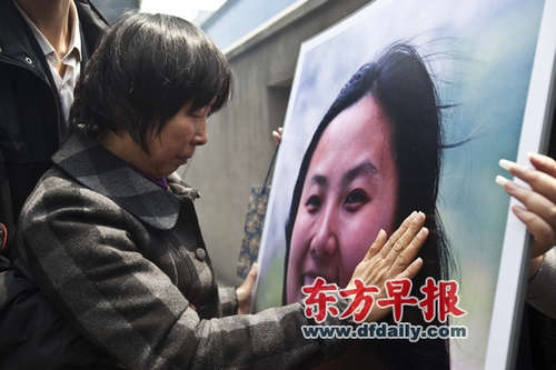 圖片說(shuō)明:昨天,寶山殯儀館,復(fù)旦抗癌女教師于娟追悼會(huì)舉行,頭發(fā)花白的于娟母親輕撫著于娟的巨幅肖像。早報(bào)見(jiàn)習(xí)記者楊一