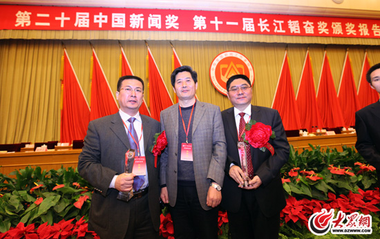大眾報業集團黨委書記、董事長、總編輯傅紹萬與中國新聞獎一等獎獲獎代表大眾網總編輯朱德泉、大眾日報首席評論員孫秀嶺合影。