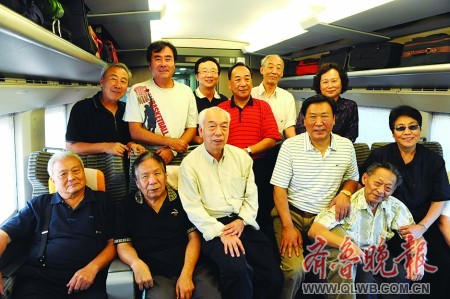 15日下午,從北京到濟南的D33次列車上,張燮林、鄭鳳榮、李淑蘭、王富洲、高健、張俊秀、黃強輝、馬元安、年維泗、郗恩庭、鄒振先等入選“全運50年體育功勛榜”的風云人物,以及著名體育節目主持人孫正平,在七號車廂相逢。 本報記者  周青先  攝