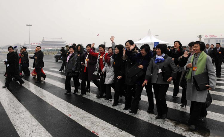 3月8日,十一屆全國(guó)人大三次會(huì)議在北京人民大會(huì)堂舉行第二次全體會(huì)議。這是全國(guó)人大代表冒雪抵達(dá)天安門(mén)廣場(chǎng)。 新華社記者陳樹(shù)根攝