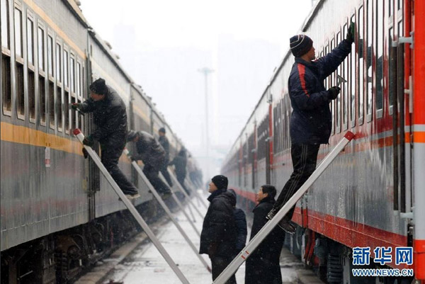 1月7日,北京客運段保潔車間人員在擦拭新增春運臨客列車的玻璃。 1月7日,北京鐵路局北京客運段上千名后勤人員開始投入到繁忙的春運工作中。他們除日常客運列車外,還將擔負新增的37列臨時客運列車的保潔、洗滌、供應、上煤、上水等工作。在臨時客運列車大量增加的情況下,他們將超負荷工作,用辛勤勞動保障春運一線旅客運輸順暢。新華社記者 唐召明 攝
