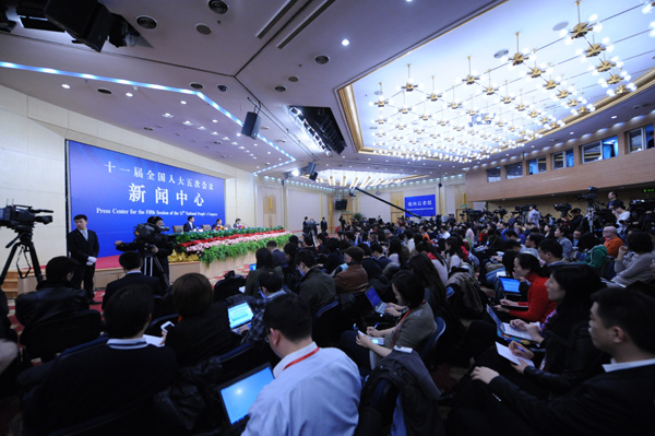 2012年3月5日,十一屆全國人大五次會議新聞中心在梅地亞中心多功能廳舉行記者會。國家發展和改革委員會主任張平就“經濟形勢與宏觀調控”的相關問題回答中外記者的提問。圖為記者會現場。王翰林 攝