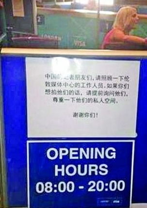 面對(duì)倫敦媒體中心用中文貼出的“中國的記者朋友們,請(qǐng)照顧一下倫敦媒體中心的工作人員,如果你們想拍他們的話,請(qǐng)?zhí)崆霸儐査麄儯鹬匾幌滤麄兊乃饺丝臻g”的“告示”,如果中國記者不提出抗議,不與其講道理,講規(guī)矩,講事實(shí),講慣例,他們會(huì)公開道歉,并取掉告示嗎?