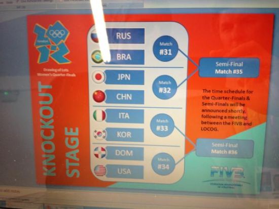 隨著今天凌晨巴西女排最終鎖定奧運8強最后一個席位,國際排聯也隨即公布了1/4決賽的抽簽結果。倫敦奧運會女排1/4決賽將于8月7日開展,中國女排將在北京時間7日晚8時迎戰A組第三名日本女排,隨后晚上22時俄羅斯女排則與巴西隊為一個四強席位展開角逐。