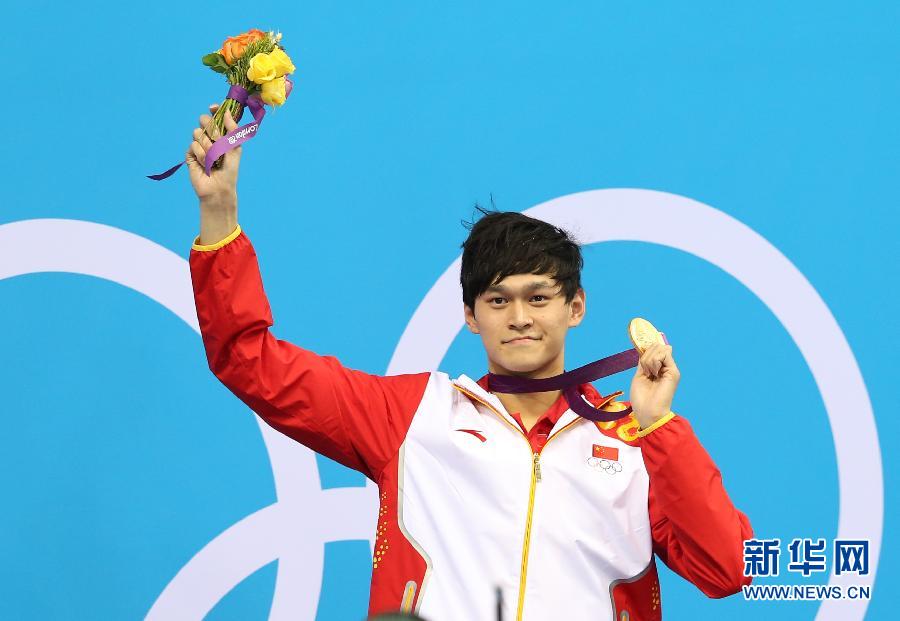 7月28日,中國選手孫楊在領(lǐng)獎臺上。當(dāng)日,在倫敦奧運會游泳男子400米自由泳決賽中,孫楊以3分40秒14的成績獲得冠軍。這是中國男子游泳在奧運會上的首枚金牌。新華社記者凡軍攝