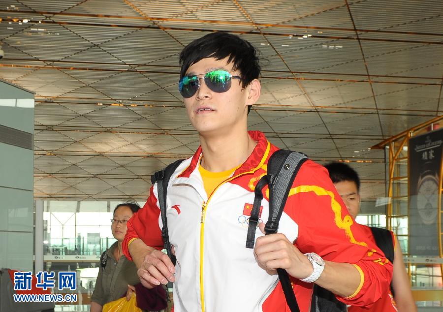 當日下午,在倫敦奧運會上贏得5金2銀3銅共10枚獎牌的中國游泳隊抵京,備受矚目的奧運冠軍孫楊、葉詩文在接受媒體采訪時第一時間表達了對關心和支持他們的所有人的感謝! ⌒氯A社發(馬儒壯 攝)