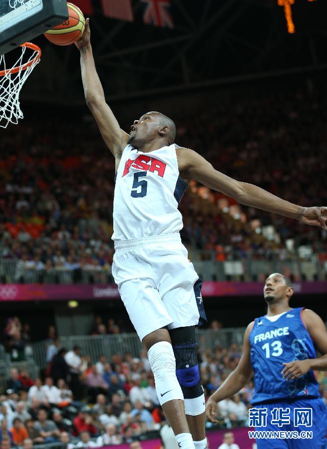 7月29日,美國隊球員杜蘭特(上)在比賽中扣籃。當日,在2012倫敦奧運會男子籃球小組賽中,美國隊以98比71戰勝法國隊。新華社記者孟永民攝
