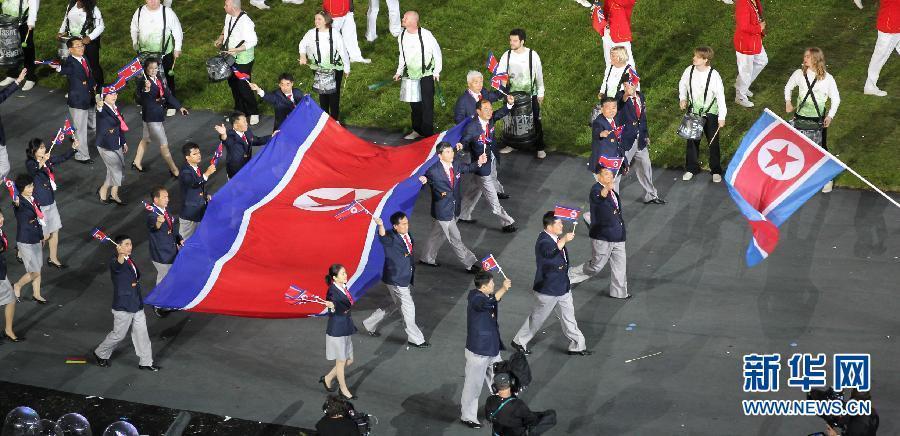 2012年7月27日,第三十屆夏季奧林匹克運動會在英國倫敦開幕。圖為朝鮮代表團在開幕式上入場。 新華社記者 王麗莉 攝