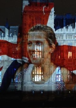 7月27日,第三十屆夏季奧林匹克運動會開幕式在倫敦奧林匹克公園主體育場“倫敦碗”舉行。這是開幕式當天,英國議會大廈的墻上打出奧運五環標志。新華社記者 凡軍 攝