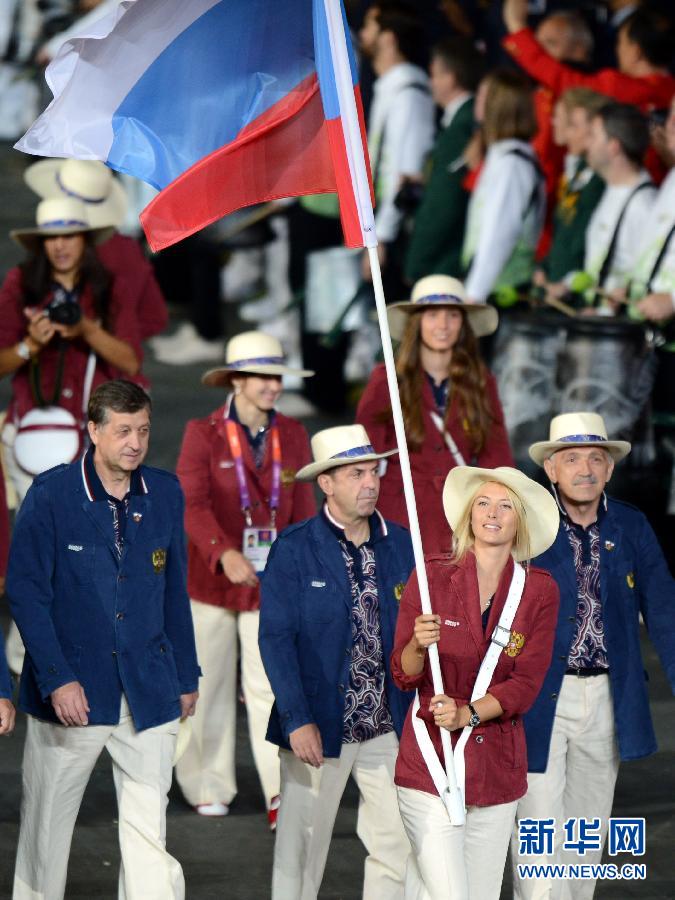 7月27日,第三十屆夏季奧林匹克運動會開幕式在倫敦奧林匹克公園主體育場“倫敦碗”舉行。這是開幕式上,俄羅斯網球選手莎拉波娃(前)執俄羅斯國旗入場。新華社記者楊磊攝