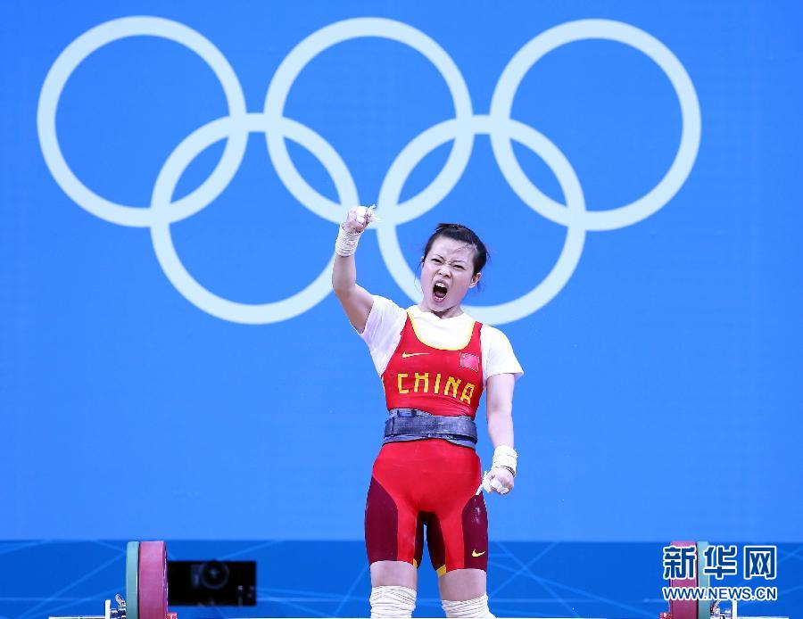7月28日,中國選手王明娟在倫敦奧運會女子48公斤級決賽中慶祝試舉成功。當日,在倫敦奧運會女子48公斤級決賽中,中國選手王明娟奪得金牌。