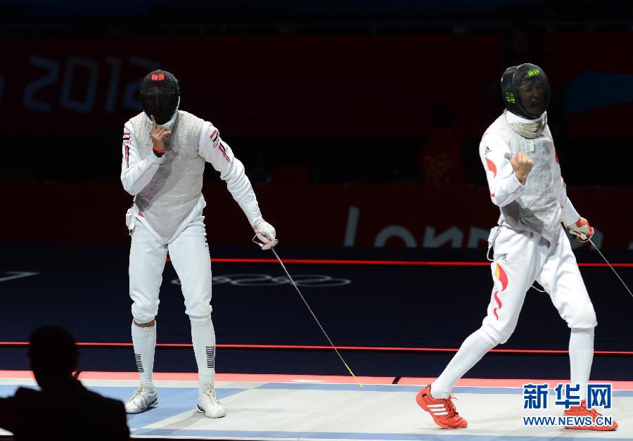 7月31日,中國選手雷聲(右)在慶祝得分。當日,在倫敦奧運會擊劍男子花劍個人決賽中,中國選手雷聲擊敗埃及選手阿布卡西姆,奪得金牌。 新華社記者 曾毅 攝