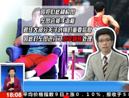 在8月10日的《共同關注》節目中,演播室背景里是劉翔治療的圖片,但鏡頭里,劉翔的“左腳”卻纏著厚厚的繃帶,與此前報道的劉翔右腳進行手術的事實不符。新聞播出后,有網友立刻找出劉翔受傷時的圖片進行對比,發現央視的鏡頭中劉翔的T恤胸前文字和發型都左右顛倒。實際上,央視之所以擺出這個烏龍是由于使用了PS鏡像處理,造成了圖片的左右調換。