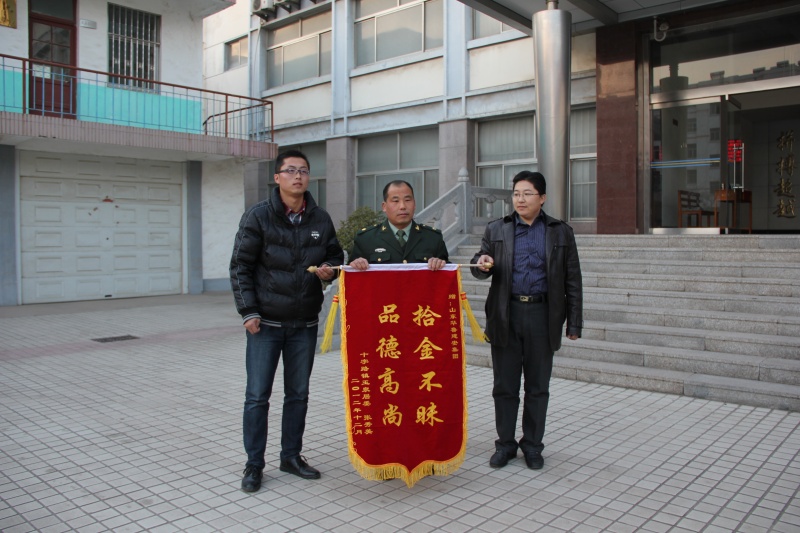 12月10日,莒南縣十字路街道玉泉居陳奎杰代表母親來到華魯集團,將一面繡有“拾金不昧,品德高尚”的錦旗和一封感謝信送到該集團保安劉學祝手中,感謝他主動送還巨款。