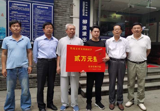 5月27日下午,菏澤技師學院黨委副書記梁衍海等緊急趕赴杭州,為劉揚壯舉備下2萬元獎勵紅包。接過母校大紅包,羞澀而又激動的劉揚表示,“感謝社會各界的關心支持,感謝母校領導的抬愛!作為每一名市民,誰遇到這個情況,都會出手相助的!”