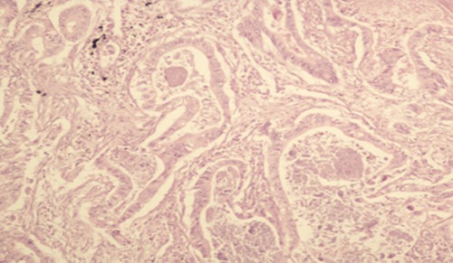 [提要] 患者李某某,女,64歲,于2009年6月因咳嗽、喘憋、痰中帶血,經(jīng)CT及病理等相關(guān)檢查確診為右肺上葉粘液腺癌, 縱膈淋巴結(jié)轉(zhuǎn)移, 左胸膜轉(zhuǎn)移,胸腔積液,因病情及體質(zhì)的原因無(wú)法接受手術(shù)及放化療等殺傷性治療,采用"中醫(yī)調(diào)胃、強(qiáng)腎、止血、化巖法"先后共治療8個(gè)月,現(xiàn)患者已有質(zhì)量的存活近3年。目前隨訪患者飲食、睡眠、體力均好,可獨(dú)立完成日常家務(wù),如今患者已經(jīng)67歲。肺癌病人李XX的病理圖片肺癌病人李XX采用“董氏治癌法”治療前后CT變化