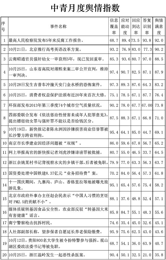 本期輿情指數(shù)中,最高人民檢察院公布5年反腐工作報(bào)告、北京市試水中高考英語改革方案、“云南昭通官員強(qiáng)奸幼女案”發(fā)回重審,分別位居綜合滿意度前3名。
