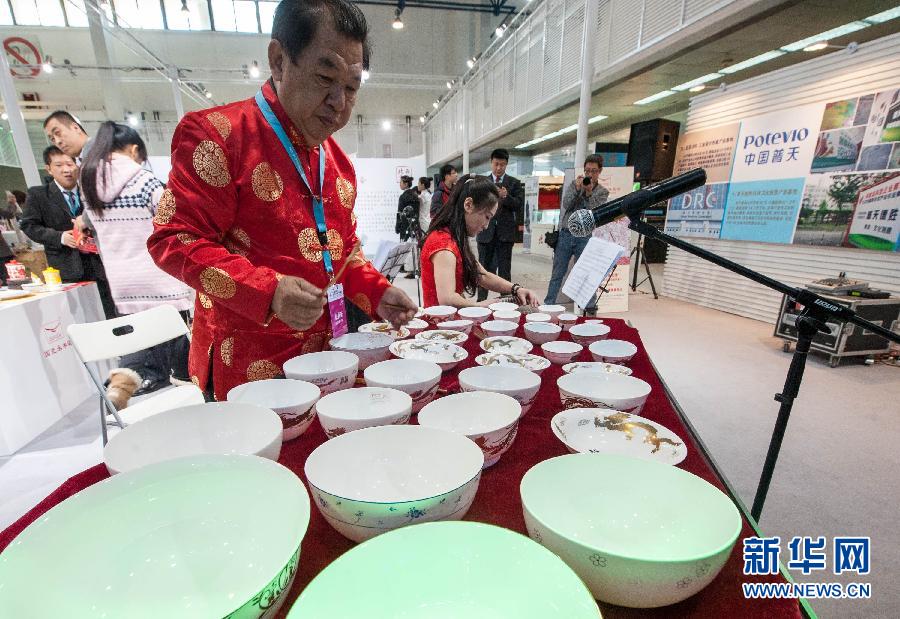 參加第八屆中國北京國際文化創(chuàng)意產業(yè)博覽會的人員在文博會上用瓷碗演奏樂曲(2013年11月7日攝)。