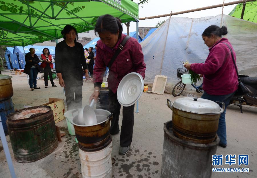 4月23日,在四川省蘆山縣一個受災群眾安置點,人們在準備早飯。4月23日,在四川省蘆山縣一個受災群眾安置點,人們早起洗漱。