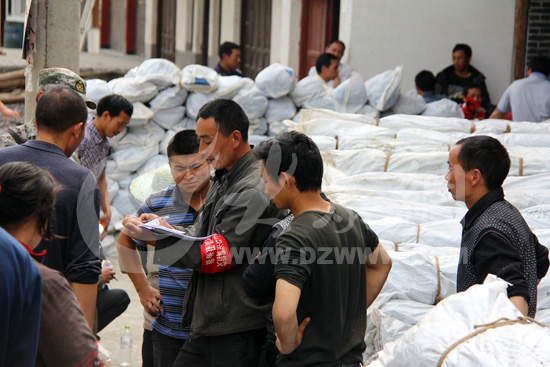 卸完貨后,中壩村會計楊平核對物資數量,迫不及待的村民圍在他身邊,等待簽字領取物資。大眾網特派記者尹海洋 攝